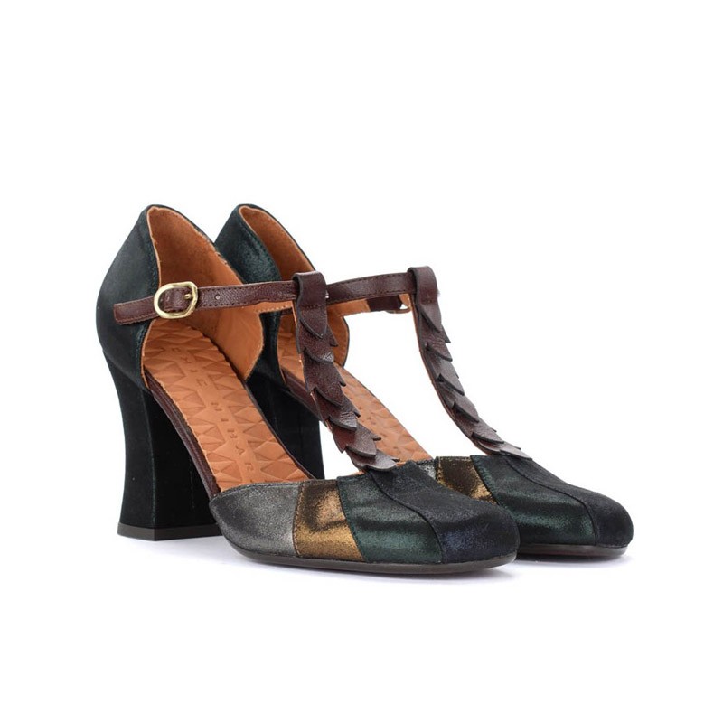 Σανδάλι Chie Mihara Fabad με τακούνι σε πράσινο laminated δέρμα. Λεπτομέρειες σε μπρονζέ, καφέ και μπλε ναυτικό. Δερμάτινη φόδρα και σόλα Καλυμμένο τακούνι Τακούνι 9 cm Δερμάτινη και αντιολισθητική σόλα από καουτσούκMade in Spain